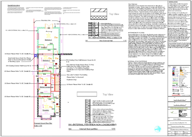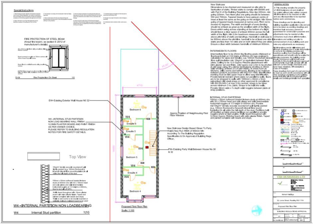 Planning drawings involved feasibility reports to concept drawings plans, elevations and site plans along with Fire safety route plans due to nature of the project. Building Regulation drawings include the structural calculation and drawings by structural team due to the complete new roof as the roof was damaged and later changed to add the height as the loft conversion was considered to accommodate 2 additional room to the property along with technical details for new floor boards, roof design, staircase relocation and addition of internal ensuite for each room.